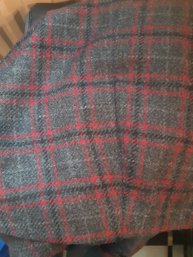 On to the next thrift shop, where I was lucky enough to find some rather fantastic yarn (for other projects, mind) AND different clothing (yay! no jeans!) as in skirts, dresses and such. They also had plenty of left over fabric. I picked up the yarn, a great looking plaid skirt and some rather bland looking soft fabric, wool-like but not that.