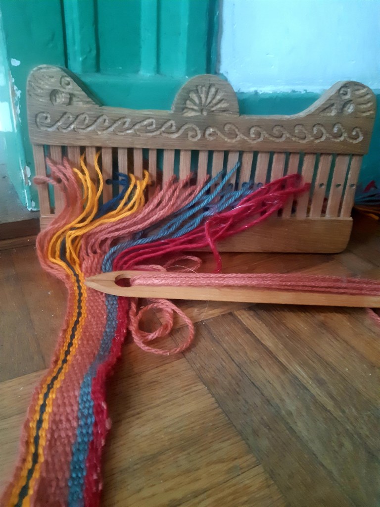 The decoration includes embroidery, couching, woven bands and braids (page 109). This is my attempt at the woven bands, the colours of the original are brownish red, yellow and green, according to this pattern: