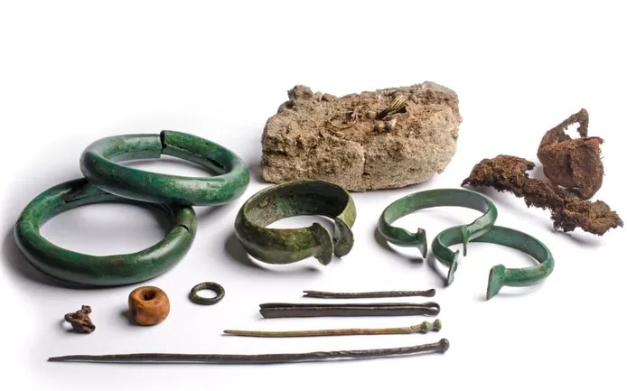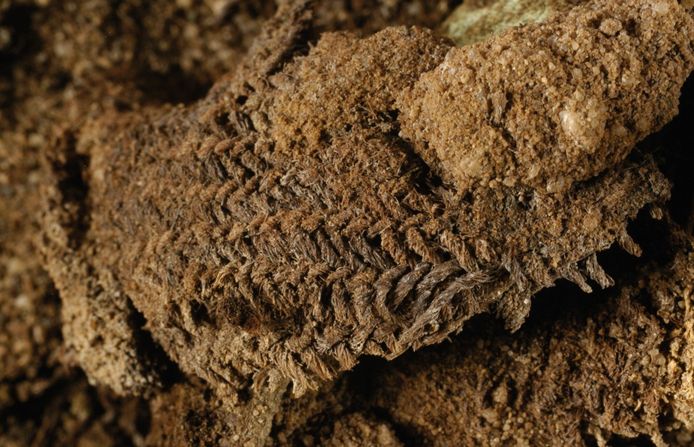 So, what’s the story here? In 2010 (yep, a while ago) some textile fragments were found in the grave of a woman from the Iron Age, near Uden. The small pieces were found on bronze and iron jewellery, bracelets and anklets which were also excavated from the same grave.