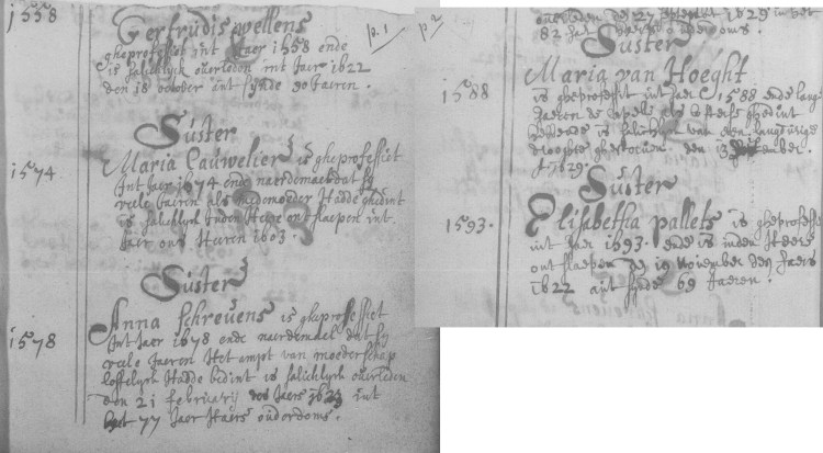 Between 1558 and 1593 a few of these sisters entered the order of the Black Sisters, which was a lay congregation, and followed the rule of St. Augustine. It is also recorded when they passed away.