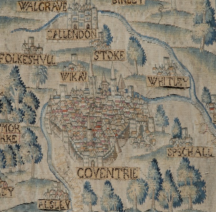 It is Shakespeare’s Warwickshire! That alone makes it a fabulous source for a persona’s place of origin. On the Sheldon Tapestry from Warwickshire, Stratford-upon-Avon is spelled with an E: STRETFORD. Coventry is CONVENTRIE and so on! Go check out this wealth of information!
